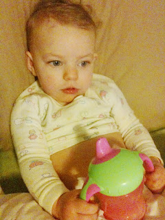 All snuggled up with my sippy cup while Mommy & Daddy get ready for work.